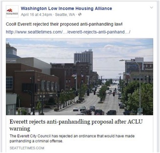Everett is one of many cities that has considered criminalizing panhandling. Here, our partners at Washington Low Income Housing Alliance share some good news on Facebook.