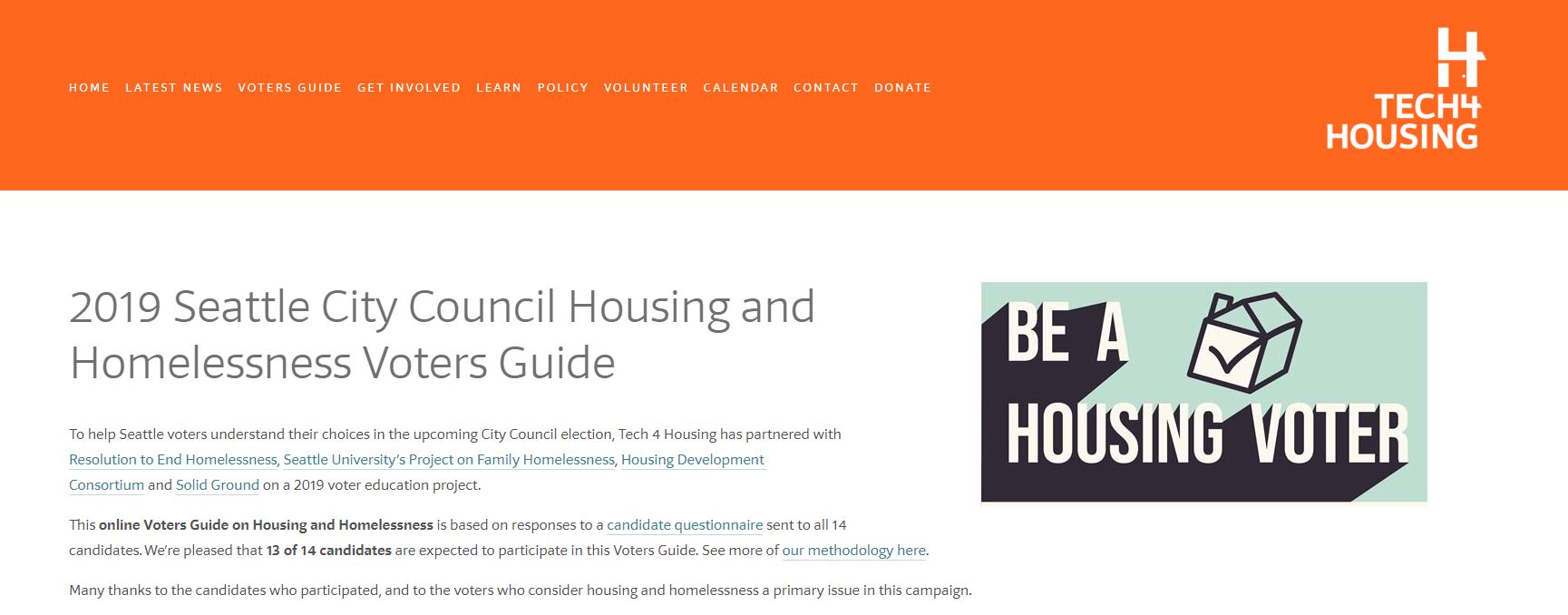 2019 is another big year for local elections, and like we did in 2017, we’ve partnered with advocacy organizations to get out the vote on housing and homelessness issues. Our two primary activities were another Voters Guide on Housing and Homelessness, and two Housing Voter Forums.